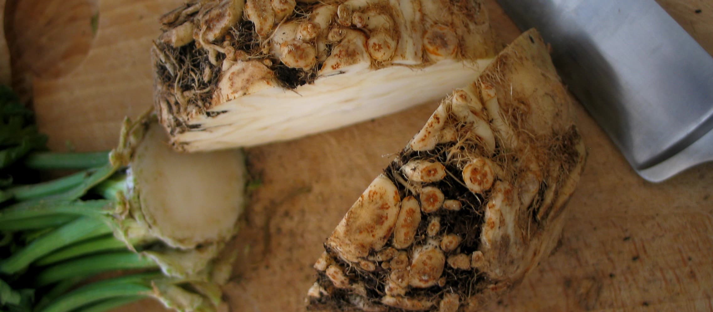 Was de knolselderij schoon. Je hoeft alleen maar de aarde er af te wassen, maar je hoeft hem niet te schillen. En snijd er dan frites van.